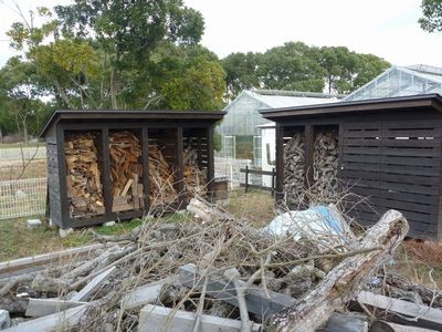 大工さんの仕事によるもので、敷地の隅にエル字型に2ヶ所に分けて作られ、片側の半分は扉付きになっていて、中に薪作りや庭仕事の道具を入れられるようになっています。
