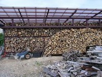 前回のリユース薪棚とはガラリと変わって、まるで「薪屋さん?」と見間違う薪小屋です。 手前の一輪車と...