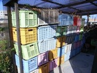 棚と言うべきか小屋と言うべきか、アルミ製のテラスの下に積み重ねられた色とりどりのみかんコンテナ群...